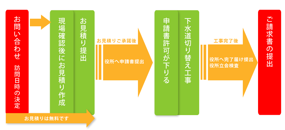 敷地と建物の状況、配管距離、浄化槽等の種類、処理方法により工事費用と期間は大きく変わ